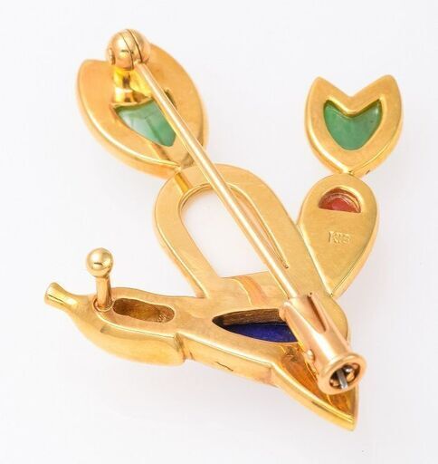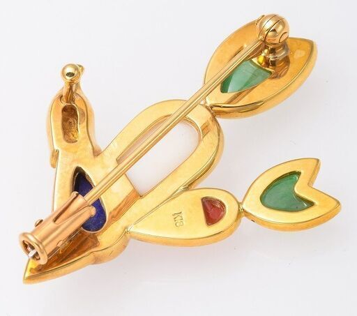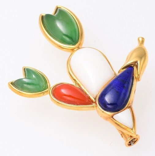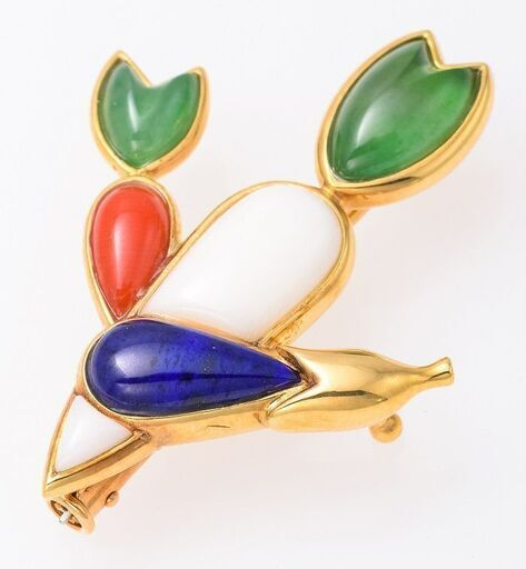ブローチ: K18 翡翠(ジェイド)・さんご(コーラル/赤・白)・ラピスラズリ [ベジタブルモチーフ]