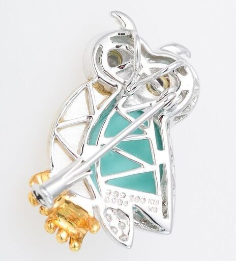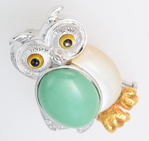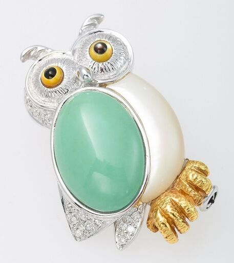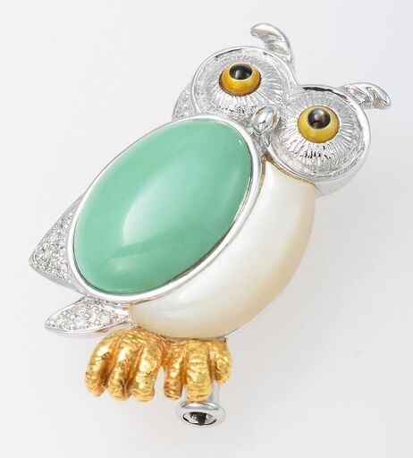 説明: 梟の姿をかたどったホワイトゴールド(18金)のブローチです。 腹はホワイトシェル(白蝶貝)、目はイエローシェル(黄蝶貝)とブラックシェル(黒蝶貝)、羽は瑪瑙(めのう)、足にはイエローゴールド(18金)が使われており、合計0.06ctのダイヤモンドも使われています。 ペンダントとしてもお使い頂けます。