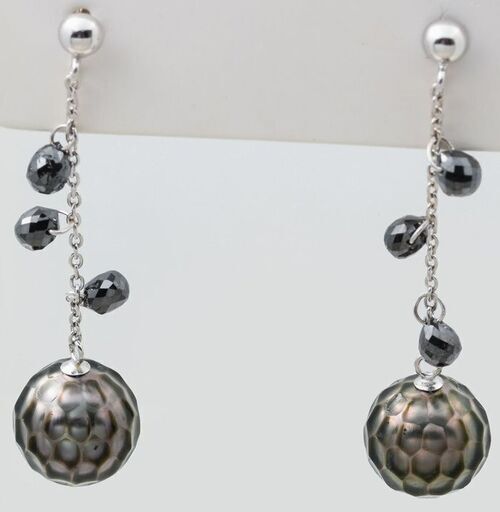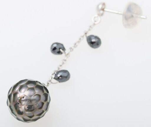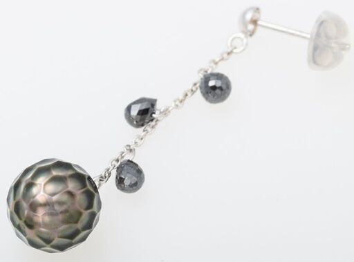 説明: ホワイトゴールド(18金)の枠にカットが施されたブラックパールが垂れ下がり、その上にはブラックダイヤモンド(方耳0.65ct、両耳合計1.30ct)が付いたピアスです。 動きにあわせてスイングするピアスが、大人らしい上質さと、どこから見ても、誰に見られても可愛い魅力を素敵に演出します。