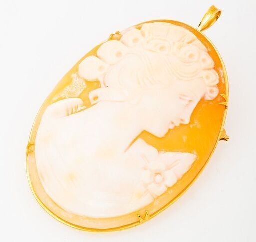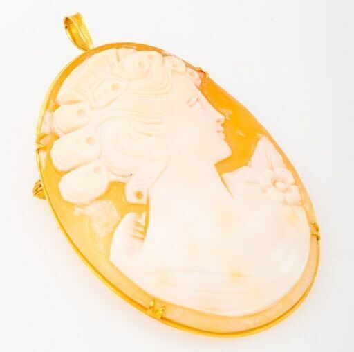 説明: シェルカメオは天然の貝の白い部分と褐色の部分を彫りこむことにより、絵柄を浮かび上がらせる全て作家による手作りの宝飾品です。 現在、世界最大の生産地としてイタリアのトーレ・デル・グレコが有名であり、また多くのカメオの作家も同地を拠点として活動を行なっています。 シェルカメオは、天然の貝を原材料とすることからその作品は一品一様でまったく同じ作品は存在しません。 また、カメオのデザインは作家のイメージより導き出されたものであり オリジナリティ、希少性、芸術性は極めて高く、その価値は欧州の多数の貴族がカメオをコレクションをしたことでも明らかです。