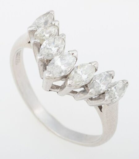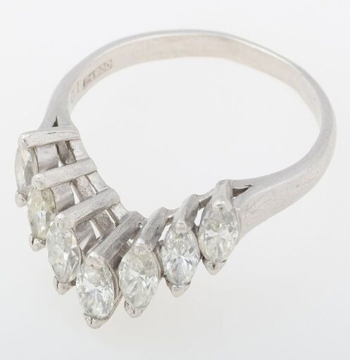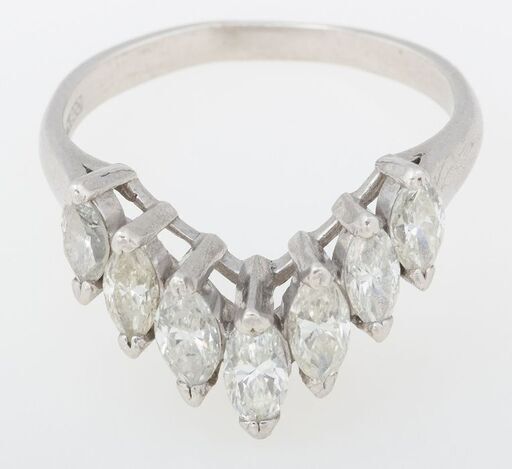 説明: プラチナ(900)の枠に、合計1.01ctのマーキスカットのダイヤモンドがV字型にセットされたリングです。 定番のデザインでどんなシーンにも合わせ易い商品です。 ※注意: 基本的に、お客様のサイズに加工してお届け致しますが、デザインの特性上、上下1号以上の加工は、ご希望に添えない(加工が出来ない)場合もございます。 不安のある方は、事前にお問い合わせ願います。