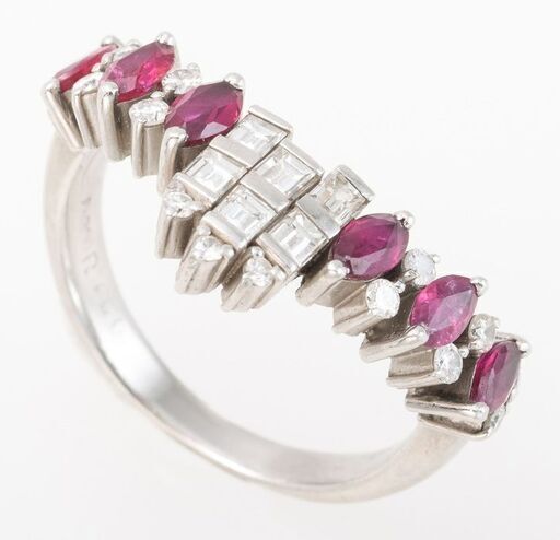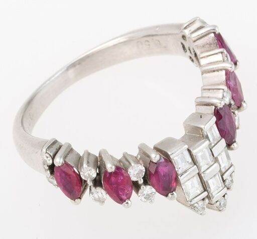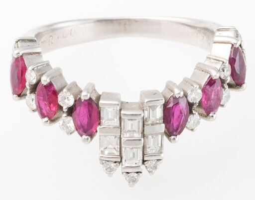 説明: プラチナ(900)の枠に、ルビーとダイヤモンドがV字型にセットされた指輪です。 マーキスカットのルビーは合計1.00ct、ラウンドブリリアントカットとエメラルドカットのダイヤモンドは合計0.50ctです。 かつては全宝石中で最も貴重とされたルビーが映えるデザインの商品です。 ※注意 基本的に、お客様のサイズに加工してお届け致しますが、デザインの特性上、上下1号以上の加工は、ご希望に添えない(加工が出来ない)場合もございます。 不安のある方は、事前にお問い合わせ願います。