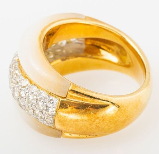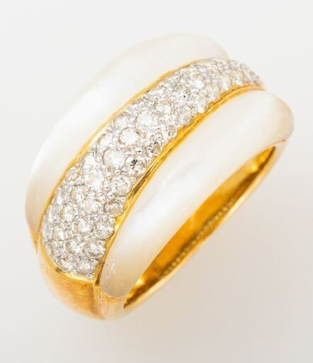 説明: イエローゴールド(18金)の枠に、ホワイトシェル(白蝶貝)とダイヤモンドがセットされたデザインの指輪です。