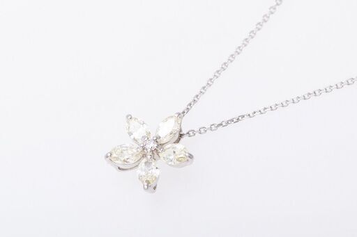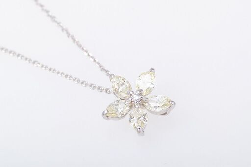 説明: 花のデザインのプラチナ(900)の枠に、合計0.58ctのダイヤモンドがセットされたネックレスです。 ハイクラスの輝きを放つダイヤモンドが首元を華やかに演出します。