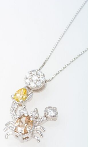 説明: カニのデザインのプラチナ(900)の枠に合計0.36ctのコニャックカラーダイヤモンドがセットされ、そのまわりにダイヤモンド(合計0.19ct)が付いたネックレスです。 冴えたクールなブラウンカラーのダイヤモンドと、片方のハサミを上げたデザインの蟹が印象的な商品です