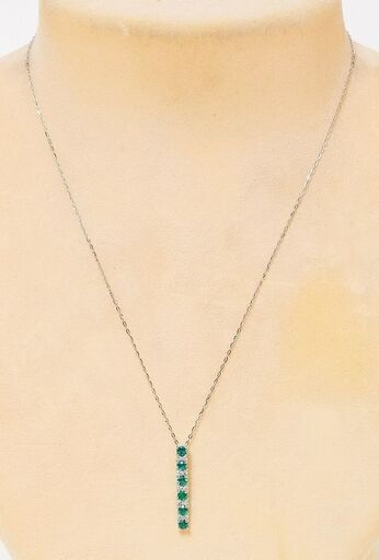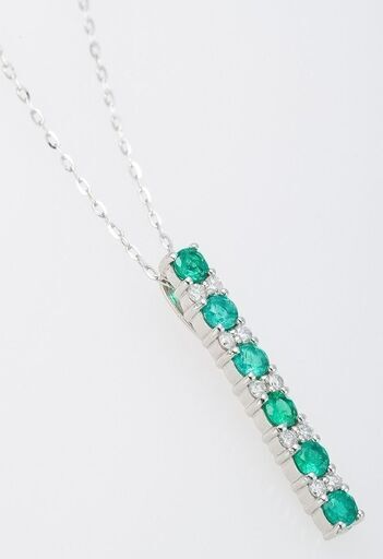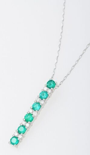説明: 濃いグリーンカラーが美しいエメラルドのネックレスです。 プラチナ(900)の枠に合計0.43ctのエメラルドが縦に並び、各エメラルドの間には合計0.13ctのダイヤモンドがセットされています。 どんなアクセサリーにも合わせ易く、首元をさり気なく演出します。