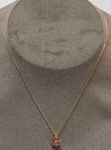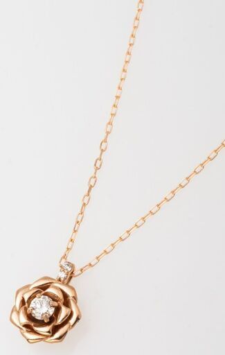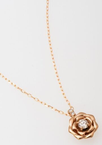 説明: バラの花のデザインのイエローゴールド(18金)の枠に合計0.10ctのダイヤモンドがセットされているネックレスです。 花の中にたくさんの花びらが波打つ、ばらの商品です。