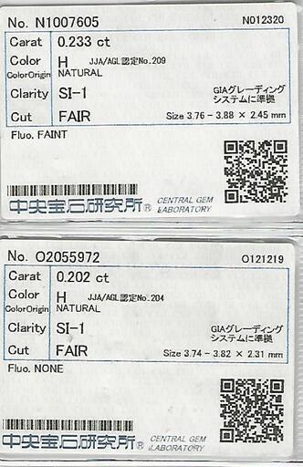 説明: プラチナ(900)の枠に、0.202ctと0.233ctのダイヤモンドがセットされたピアスです。 ダイヤモンドのグレードは以下の通りです。